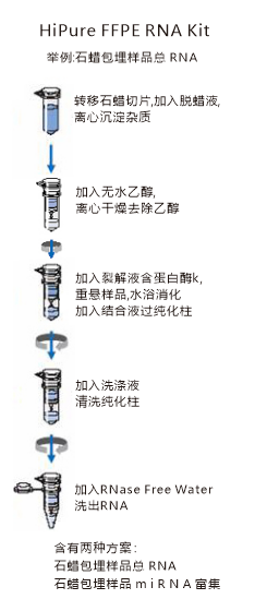 Kit是专门为石蜡包埋组织小分子RNA抽提而设计的。试剂盒基于硅胶柱纯化技术,提取过程中无需使用有毒的酚氯仿抽提,也无需进行耗时的醇类沉淀,整个提取过程只需60分钟。纯化的RNA可直接用于RT-PCR、Northern