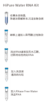水体样本收集再在特殊裂解液和含有玻璃珠的管内珠磨,离心得到澄清上清加入结合液,在玻璃纤维柱内结合核酸,在通过两次清洗洗去杂质,最后用少量水洗出。