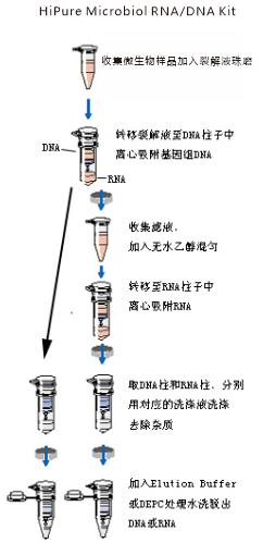 | 本试剂盒采用玻纤滤膜纯化技术,只需进行简单的结合-洗涤-洗脱的步骤。样本在含胍盐的裂解液和玻璃珠的管内进行破碎和匀浆,裂解物转移至DNA过滤柱离心,则DNA被高效吸附至DNA柱子中,收集含RNA的滤液,加入乙醇以提供合适的结合条件,并转移至纯化柱中并离心,高达100µg的RNA可被选择性结合到膜上,污染物经三次清洗被高效洗去,最后纯化RNA被RNase Free Water洗脱出来,最后纯化DNA被Elution Buffer洗脱出来。 | |